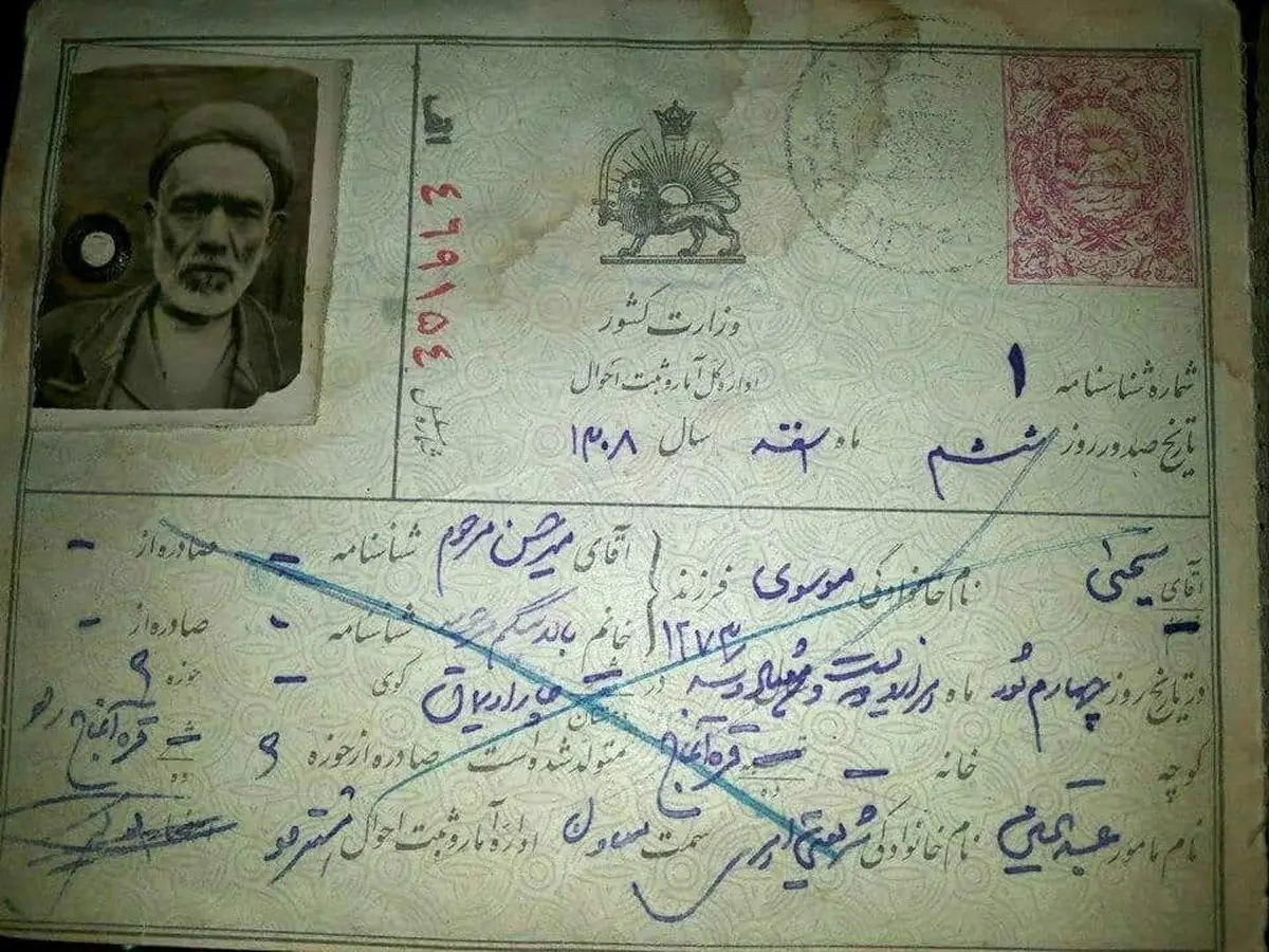 به گزارش رکنا :این شناسنامه در تاریخ سال ۱۳۰۸ششم اسفند ماه بنام یحیی موسوی فرزند میر حسین مرحوم از سادات منطقه صادر شده است