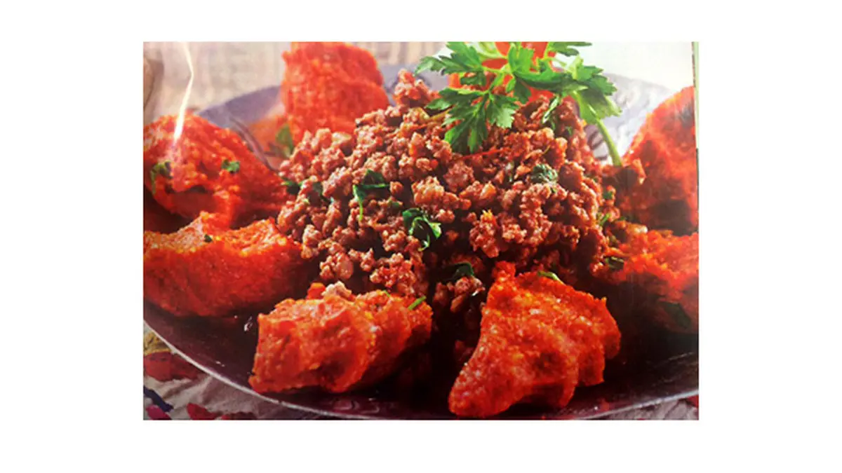 روغن را در ظرف مناسبی روی حرارت گرم کنید و گوشت چرخ کرده را در آن تفت دهید تا رنگ آن عوض شود. پیاز ریز خرد شده را اضافه کرده و تفت دهید. فلفل سبز، گوجه فرنگی، رب گوجه فرنگی، نمک، فلفل سیاه و برگ جعفری خرد شده را به مواد اضافه و مخلوط کنید. پس از چند دقیقه تفت دادن ظرف را از روی حرارت برداشته و کنار بگذارید.