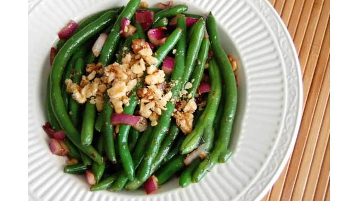 این سالاد لوبیا سبز خوشمزه و نشاطآور خیلی خیلی ساده است و مواد زیادی نیاز ندارد. لوبیا سبزی که کمی پخته شده، گردو و سس سالم و خوشمزهای با پایه سرکه مواد اصلی این سالاد هستند. برای تهیه سالاد لوبیا سبز سرکه ای، از لوبیا سبزی استفاده کنید که ترد باشد و وقتی آن را تا کنید با یک صدای خرچ خروچ جذاب از وسط نصف شود. لوبیا سبزی که نرم باشد و تا شود به درد سالاد نمیخورد اما میتوانید با آن سوپ یا لوبیا پلو درست کنید.