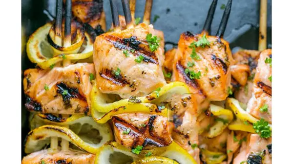 ماهی از مفیدترین غذاهای حاوی پروتئین است که همیشه دنبال راه های تازه برای طبخ آن هستیم. کباب سالمون لیمویی این فرصت را فراهم میکند که یک وعده غذایی جدید حاوی این ماده مفید را به برنامه غذایی خود اضافه کنیم. در ضمن کباب سالمون لیمویی بسیار زیبا و شیک هم هست و حتی میتوانید آن را در مهمانی Party ها سرو کنید. فقط کافی است ماهی ها را خرد کنید و همراه با لیمو ترش سیخ بگیرید. بعد هم یک سس عالی از لیموترش، خردل، جعفری و ادویه جات روی آن میمالید تا کباب سالمون طعم بهتری پیدا کند. کباب سالمون لیمویی را میتوانید روی گریل تهیه کنید یا در تابه روی شعله سرخ کنید.