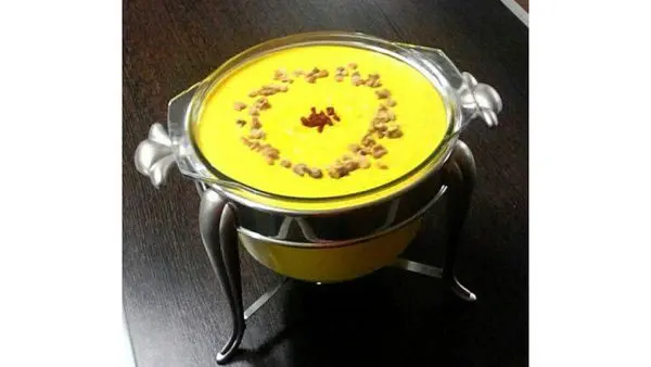 کمی بعد نمک، مغز گردو، خلال بادام، زعفران و گلاب را نیز اضافه کنید. بعد از چند دقیقه آن را از روی حرارت بردارید و به ظرف سرو مورد نظر انتقال دهید. بهتر است خورش را 24 ساعت درون یخچال قرار دهید تا خوب خنک شود. این خورش سرد سرو می شود.