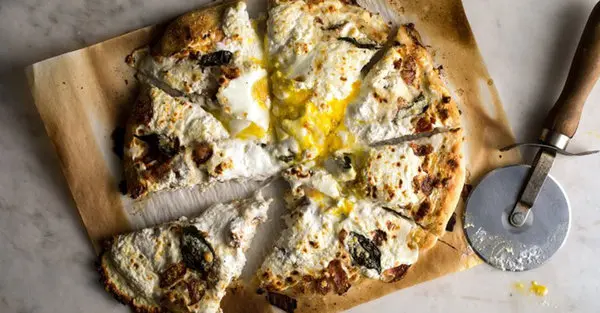 بهتر است به جای پنیر موزارلا از پنیر بوراتا که ترکیب پنیر موزارلا و خامه است استفاده کنید. خامه موجود در بوراتا نمناکی خوبی به ترکیب شما میدهد. موزارلای تازه به طور طبیعی حالت خامهای و شیرین دارد و با پنیر موزارلا نیز میتوانید این کار را انجام دهید چون در این پیتزا تمرکز روی بیکن سرخ شده و تخم مرغ پخته شده است.