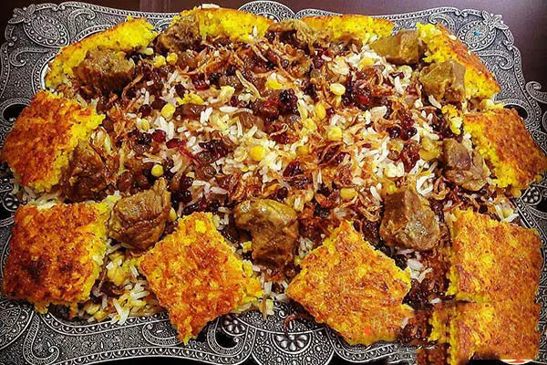 مرحله پنجم:کشمش و زرشک را جداگانه با کمی روغن تفت بدهید. برنج دم کشیده را با زعفران مخلوط کنید و موقع کشیدن لا به لای آن زرشک و کشمش بریزید و مقداری را برای تزیین کنار بگذارید. در آخر روی پلو را با مخلوط گوشت و پیاز داغ، کشمش و زرشک تزیین کنید.برای ورود به کانال تلگرام ما کلیک کنید.