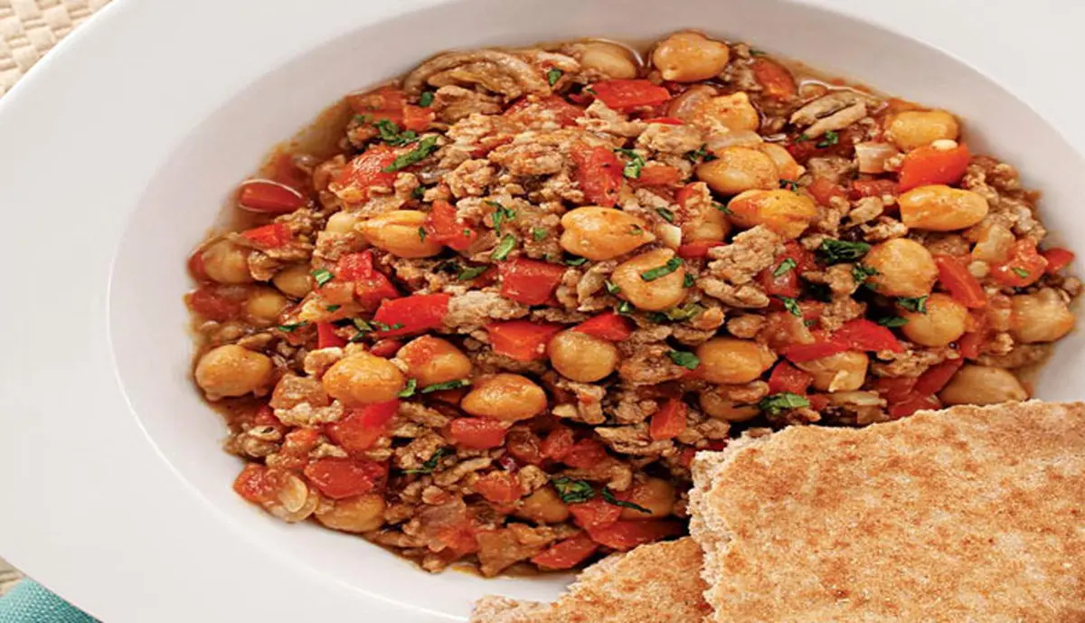پیاز و سیر را در یک قاشق روغن زیتون روی حرارت ملایم تفت دهید. فلفل دلمهای را به آن اضافه و با آن مخلوط کنید. وقتی مواد شما کمی نرم شد گوشت بوقلمون چرخکرده را هم اضافه کنید و با بقیۀ مواد تفت دهید. در این مرحله گوجهفرنگی پوستگرفته و خردشده را به مواد اضافه کنید و تفت دهید. حالا در تابه را بگذارید تا مواد شما جا بیفتد. بعد از چند دقیقه که تابه بخار کرد و مواد با هم پخت درش را بردارید و نخود پخته را با مواد مخلوط کنید و خوب هم بزنید. نمک و پودر چیلی را هم به خوراک اضافه کنید و کمی تفت دهید. خوراک شما آماده است. آن را در ظرف مناسب با کمی گشنیز خردشده سرو کنید.