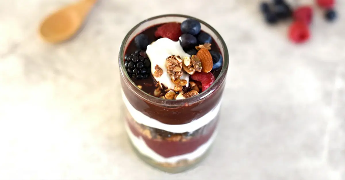 یک لیوان بردارید، داخل آن مقداری ماست ایسلندی بریزید به طوری که یک‌ششم لیوان را پر کند، به همین ترتیب غلات و توت فرنگی را ریخته و لیوان را پر کنید.