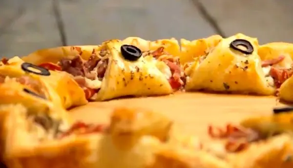 خمیر را روی سطح کار صاف کنید و مطابق ویدئو، برش بزنید. گوجه ها را روی سطح برش خورده قرار دهید. به همین ترتیب، پنیر فتا، پنیر سوئیسی و ژامبون گوشت را لایه لایه، مطابق ویدئو روی سطح خمیر قرار دهید. خمیر را به آهستگی و با دقت، به صورت مثلثی، رول کنید. پونه کوهی را، روی آن بریزید و بعد، سطح خمیر را توسط برس، به تخم مرغ آغشته کنید. در آخر زیتون ها را روی سطح خمیر گذاشته و مواد را به مدت ۳۰ دقیقه، تحت حرارت ۴۰۰ درجه فارنهایت در فر قرار دهید.برای ورود به کانال تلگرام ما کلیک کنید.