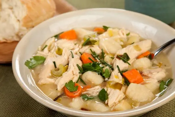 حالا پیاز، کرفس، هویج، رزماری و آویشن را درون تابه بریزید تا برای ۷ دقیقه با هم بپزند و سبزیجات ترد و نازک شوند. سپس ۴ فنجان آب مرغ اضافه کنید و شعله را کاهش دهید و بگذارید ۸ دقیقه در آن حالت بمانند. در آخر نیوکیها را به آن اضافه کنید و بگذارید برای ۳ دقیقه بپزند و روی سطح شناور شوند.