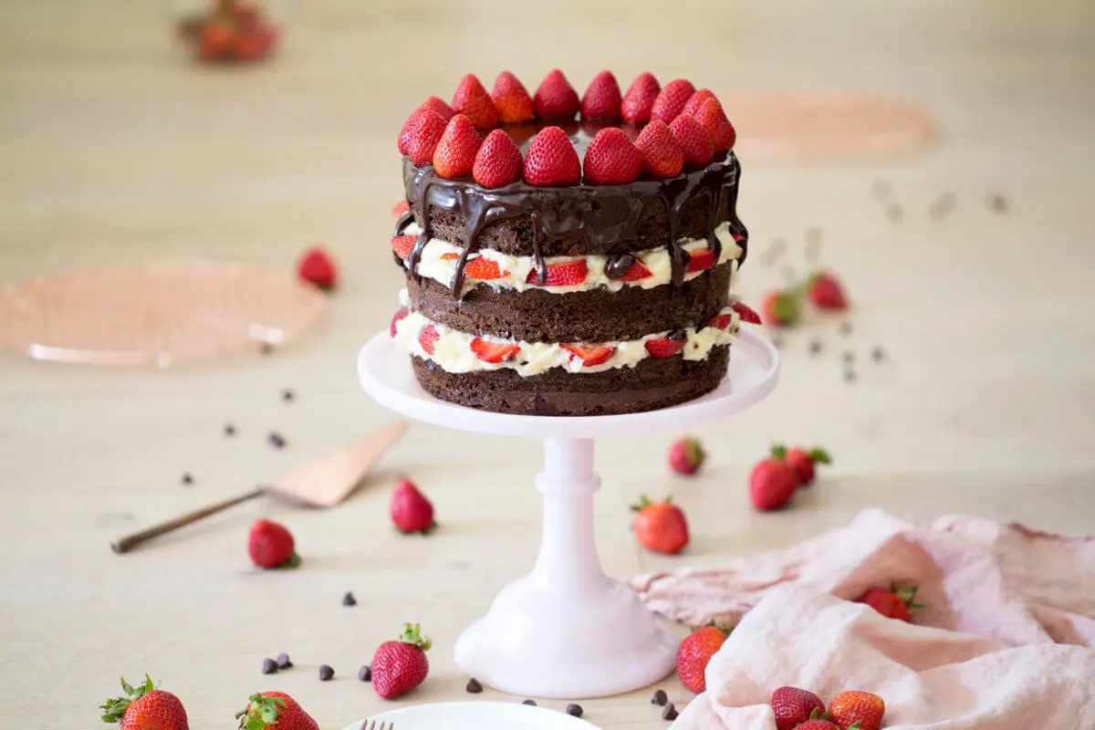 سپس کیک را کمی حرارت دهید تا جایی که از اطراف کیک، حباب هایی از خامه بیرون بزند. در انتها روی کیک را با خامه و توت فرنگی تزیین کنید.