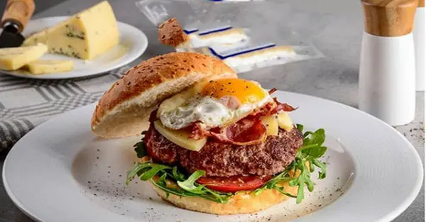 برگرها را روی گوجه فرنگی‌ها بچینید. یک عدد نیمرو و یک اسلایس بیکن روی آن قرار دهید و مقداری بلوچیز روی هر ساندویچ بریزید. سپس لایه‌ رویی نان را روی آن قرار داده و سرو کنید.