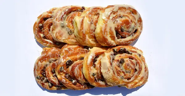 روی یک تخته مقداری آرد بپاشید. خمیر را با وردنه صاف کنید و به ابعاد ۳۰ در ۴۰ سانتیمتر درآورید. خامه قهوه را روی خمیر ریخته و سطح آن را صاف کنید. خمیر بادام و کشمشها را روی خمیر ریخته و پخش کنید. پودر دارچین و بقیه شکر را اضافه کرده سپس از طرف باریکتر خمیر را لوله کنید و به شکل حلزون دربیاورید.
