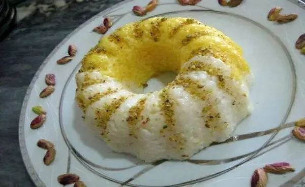 - دسر دیگچه مشهدی را داخل ظرف بکشید و روی آن را با زعفران دَمکرده و خلال پسته تزئین کنید.