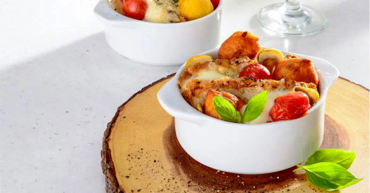توپکهایی که سرخ کردهاید را به همراه پنیر موزارلا، گوجه فرنگی مینیاتوری و نان تست روی آنها بچینید و در نهایت مقداری از مایه تخم مرغی روی آنها بریزید.