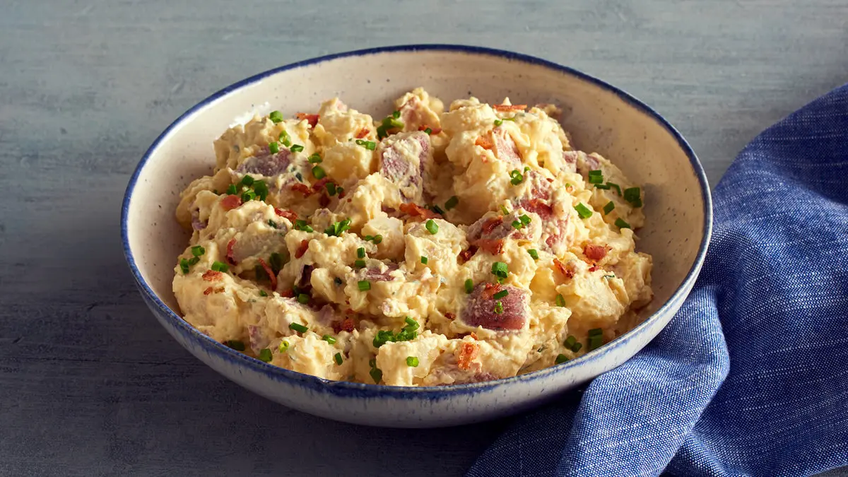 یک کاسه بزرگ بردارید. سیب زمینیها، پیازچه، بیکن، ذرت، ماست، پنیر سیامزگی، پنیر موزارلا، فلفل هالوپینو، نمک و فلفل و جوانه گندم را داخل کاسه بریزید. همه مواد را با هم مخلوط کنید. به وسیله سلفون روی ظرف را بپوشانید و سالاد را به مدت نیم ساعت داخل یخچال قرار دهید تا مزهها به خورد هم بروند.