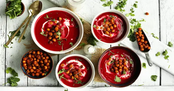 این سوپ با لبو، سیب زمینی و هویج تهیه میشود و رنگ بسیار جذابی دارد.
