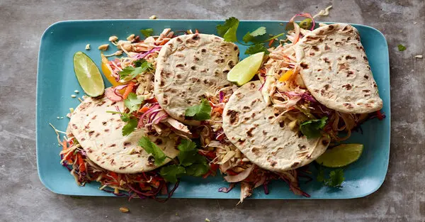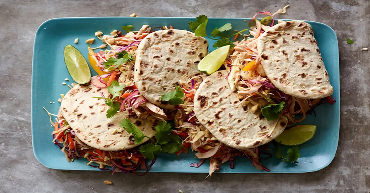 بعد از این که همه مواد را با هم مخلوط کردید. نان پیتاها را روی میز کارتان پهن کنید. سپس مواد را روی نصف نانها بریزید و طرف دیر نان را برگردانید.
