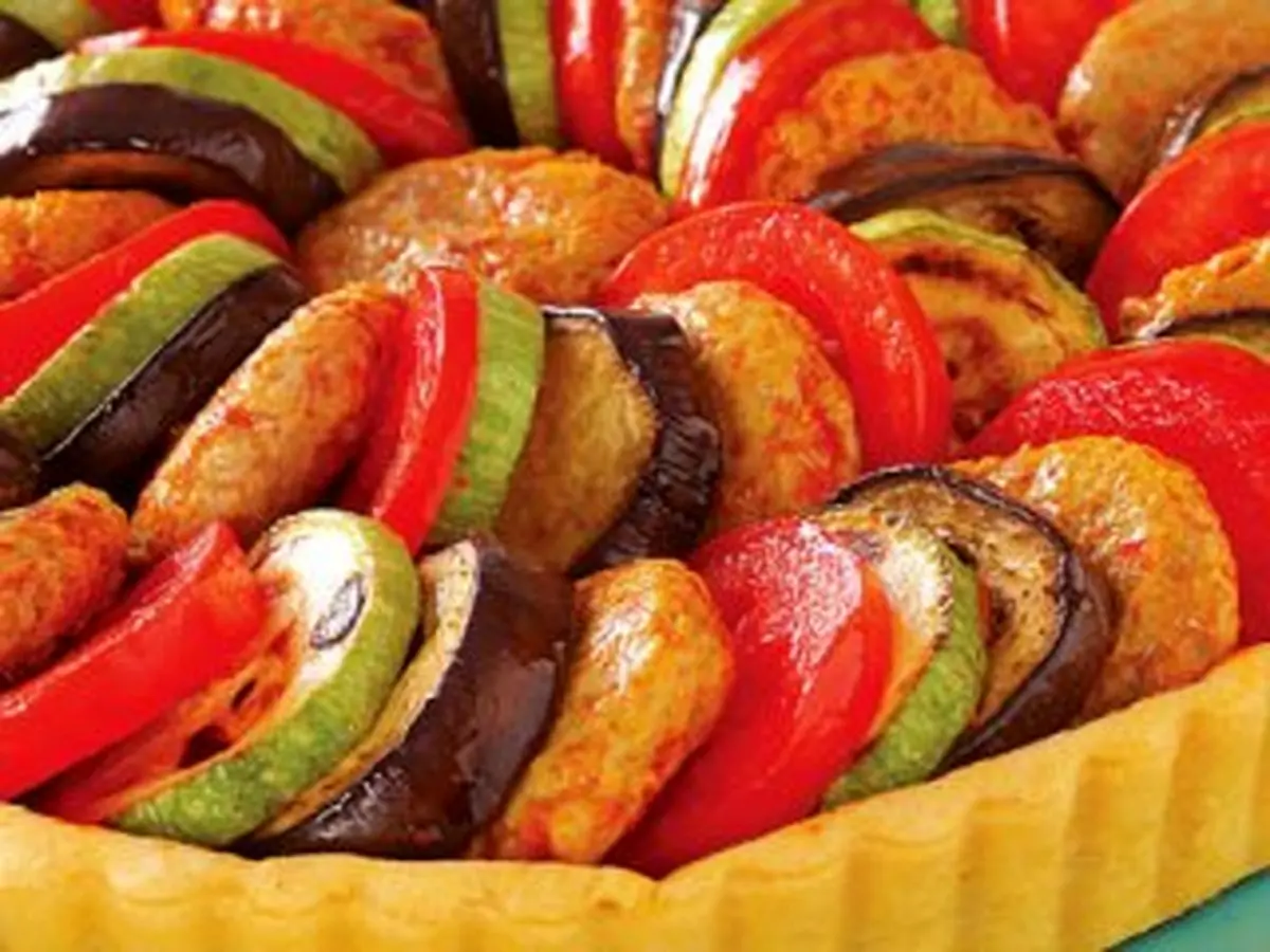 اینک کف خمیر را به سس آغشته کنید و به ترتیب بادمجان، کدو، گوجه و گوشت را در خمیر بچینید و خمیر را در فر گرم کرده با دمای 180 درجۀ سانتیگراد به مدت نیم ساعت بپزید.برای ورود به کانال تلگرام ما کلیک کنید.
