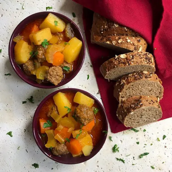 ۸. وقتی سبزیجات پختن در نیم ساعت نهایی میت بال هارو اضافه کرده و نمک و فلفل هم به خوراکتون بزنین و اجازه بدین تا خوب جا بیوفته و به غلظت مناسب برسه. برای خوش طعمتر شدن خوراکتون میتونین به جای نمک از نصف تا یک قرص طعم دهنده گوشت استفاده کنین.