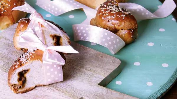 4 بعدازآنکه خمیر عمل آمد، آن را به 8 قسمت مساوی تقسیم کنید. هرکدام از چانهها را باز کنید و مقداری از مواد میانی را داخلش قرار دهید. روی مواد یکتکه پنیر هم بگذارید. حالا خمیرها را بهآرامی لوله کرده و آنها را به شکل گل درآورید، سپس آنها را داخل سینی فر بچینید.
