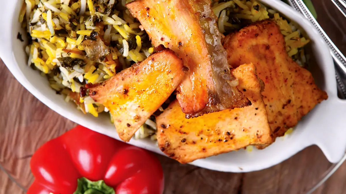 4 در آخر پیاز داغ را روی برنج ریخته و ماهی را روی آن بگذارید. زعفران دم کرده را هم روی برنج بریزید و برنج را به مدت 45 دقیقه دم کنید. سپس غذا را سرو کنید.