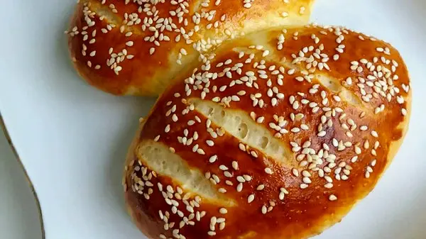 این خمیر چربه و نیاز به آردپاشی سطح کار نیست خمیر آماده رو به اندازه های دلخواه چانه کنید ۱۵ دقیقه استراحت بدین بعد چانه ها رو با دست باز کرده مواد میانی بذارین به شکلی که تو ویدیٔو نشون دادم جمع کنید داخل سینی چرب شده با روغن جامد با فاصله قرار بدین پوشانده ۳۰ دقیقه استراحت بدین برای رومال زرده باقیمونده رو با یک قاشق چایخوری شکر و روغن مایع مخلوط و آروم رومال بزنید بعد کنجد فراوون بریزید و با تیغ روی نونها ۳ برش اریب بزنید داخل فر گرم با دمای ۲۰۰ درجه قرار بدین به مدت حدود ۲۰ دقیقه