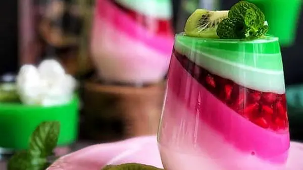 حالا بیایید به ژله باقیمونده یه قطره رنگ قرمز اضافه کنید و هم بزنید و دوباره از مواد بریزید روی مواد کمرنگ تر و این مرحله رو یکبار دیگه تکرار کنید
