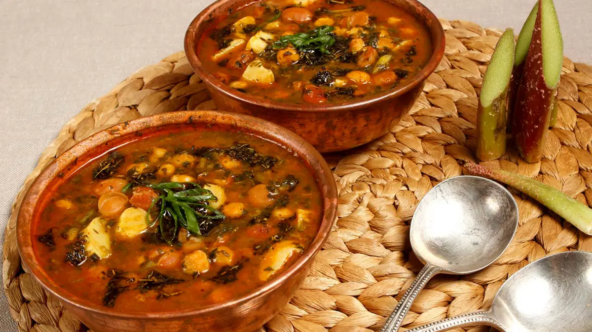 نخود و لوبیا را از شب قبل در آب خیسانده و چندین بار آب آن را عوض کنید تا آب آن عوض شود. بعد از پخته شدن حبوبات، هویج و سیب زمینی را اضافه کنید و اجازه دهید که نرم شوند، سپس آلو، برگه زردآلو و لبو را به مواد اضافه کنید.