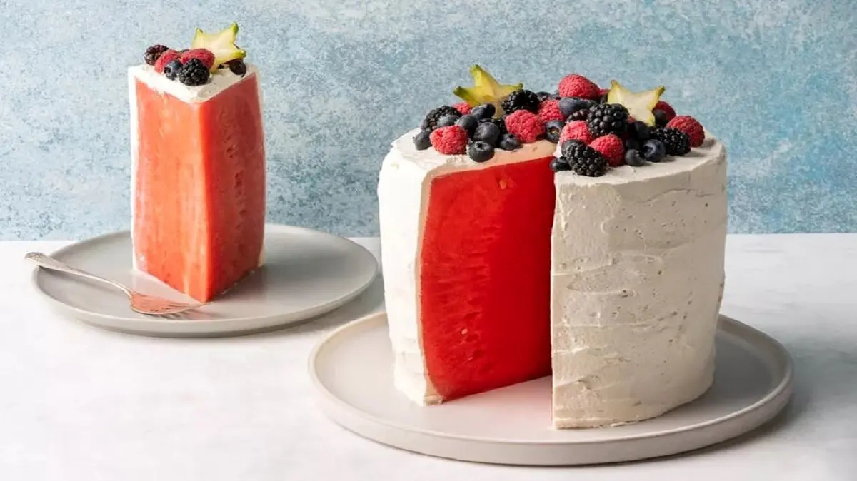 این کیک هندوانهای آب نمیشود و ساعتها در یخچال یا در دمای اتاق شکل خود را حفظ میکند؛ فقط کافی است ژلاتین را در آب حل کنید و سپس آن را به مخلوط خامه بزنید.