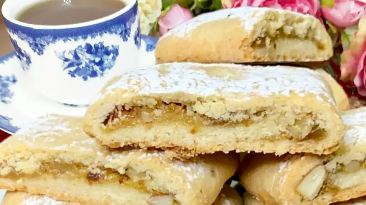 پس از این مدت از یخچال خارج کرده و روی سطح آردپاشی شده به شکل مستطیل باز کرده و از مارمالاد در قسمت وسط خمیر گذاشته و بادام را روی مارمالاد بپاشید و خمیر را از دو طرف روی مارمالاد آورده و به اندازه دلخواه برش بزنید و در سینی فر چیده و به مدت ۱۰ تا ۱۵ دقیقه در فر از قبل گرم شده با حرارت ۱۸۰ درجه بپزید. بعد از پخت اجازه دهید شیرینی ها کاملا خنک شود سپس از دیس جدا و با پودر قند تزئین کنید.