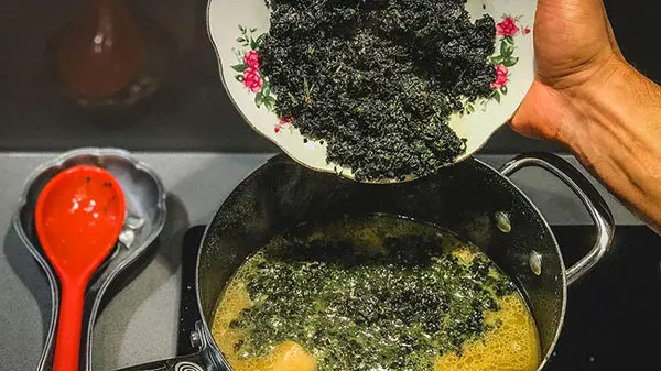 یک بسته سبزی را در تابه می ریزیم و با حرارت کم اجازه می دهیم حسابی آب سبزی تبخیر شود و بعد روغن اضافه می کنیم. روغن می خورد دوباره به آن روغن اضافه می کنیم. حرارت باید کم باشد و کم کم روغن اضافه کنیم و مرتب هم بزنیم. تقریبا چهل دقیقه باید روی گاز بماند تا حسابی تیره شود. بعد از این زمان گوشه تابه کمی روغن بریزید و مقداری شنبلیله خشک تقریبا دو ق غ پودر شده بریزید و تفت دهید تا کمی تیره شود. آن را به بقیه سبزی ها اضافه و همه را با هم مخلوط کنید. خاموش کنید. نصف لیوان لوبیای قرمز را که از شب قبل خیس کردید بهتر است با مقداری آب روی حرارت بگذارید ده دقیقه بجوشد و بعد آبکش کنید.