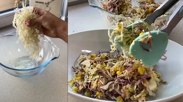 همه مواد را مثل فیلم خرد و ترکیب کنید. سالاد اندونزی یک سالاد خوشمزه است اما برخی افراد شاید طعم هویج و خیارشور را در آن نپسندند که می توانند حذف کنند. به جای سس مایونز هم سس فرانسه یا هزارجزیره بریزید که طعم بهتری دارد.