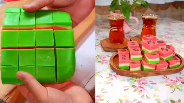 ژلاتین را با آب ترکیب کرده و بنماری می کنیم.شیر، شکر، کره و خامه را روی حرارت کم هم می زنیم تا آب شده و یکدست شود. اجازه می دهیم 4 دقیقه بجوشد و مدام هم می زنیم. از روی حرارت برداشته و شکلات را اضافه می کنیم. سعی می کنیم به 3 قسمت تقسیم شود؛ قسمت بیشتر را قرمز می کنیم. متوسط را سبز و قسمت کمتر سفید بماند. ظرف مستطیل شکل چرب شود و بعد نایلون می اندازیم. اول مایه سبز رنگ و 10 دقیقه در یخچال می گذاریم، بعد مایه سفید را افزوده و 10 دقیقه در یخچال می گذاریم و در آخر مایه قرمز را به آن می افزاییم و صبر می کنیم تا حداقل ۶ ساعت در یخچال بماند و بعد برش زده و میل می کنیم.
