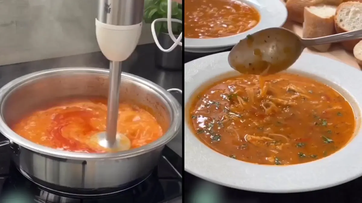 پیاز را نگینی خرد و سرخ کرده با آرد و مقداری رب و عدس تفت دهید و آب بریزید تا پخته شود. با گوشتکوب برقی مواد را میکس کنید. مرغ ریش ریش شده را با پاپریکا و ادویه های لازم و کمی سیر به آن بیفزایید. اجازه دهید تا سوپ شما چند ساعت پخته شود. نوش جان