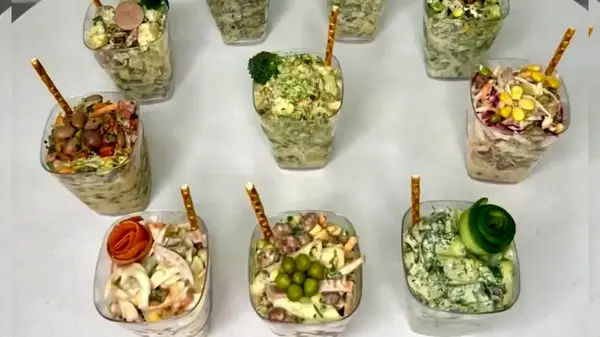 ماکارونی شکلی، کالباس، سیب زمینی پخته، ذرت و نخودفرنگی کنسروی یا بخارپز، خیارشور، فلفل دلمه ای ، هویج پخته