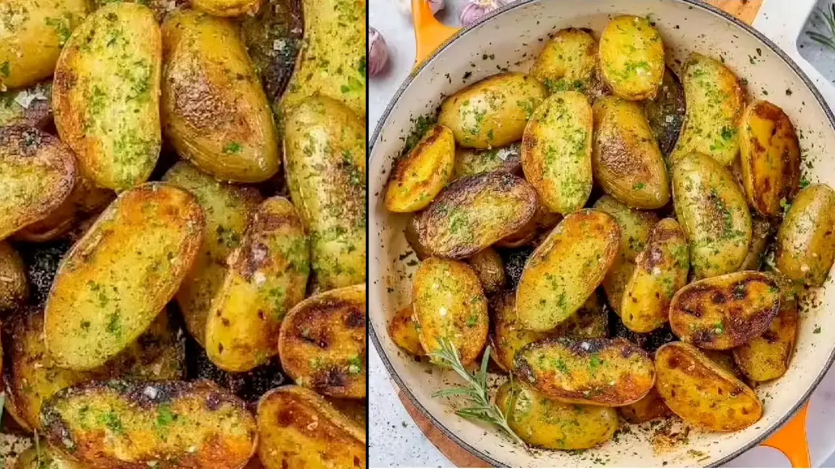 سیب زمینی ها را بدون اینکه پوست شان را بگیرید، تمیز بشویید، از وسط برش بزنید و در یک کاسه بزرگ بریزید سپس یک قاشق روغن ، نمک ، فلفل ، پودر پیاز ، سیر ، آویشن و رزماری را اضافه کرده و کامل مخلوط کنید، یک ماهیتابه نچسب را روی حرارت متوسط گرم کنید بعد سیب زمینی ها را کف تابه بچینید و 1/2 لیوان آب اضافه کنید، در تابه را گذاشته و اجازه دهید تا سیب زمینی ها برای مدت 35_30 دقیقه بپزند تا نرم شوند(البته بعد از 20-15 دقیقه چک کنید اگر آب بیشتری نیاز دارد اضافه کنید)