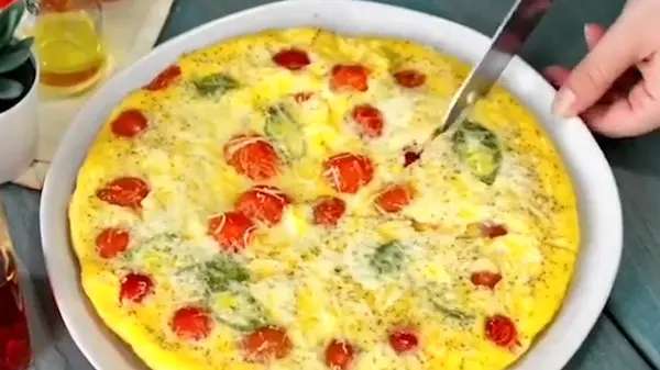 گوجه فرنگی ها را به نصف برش دهید. در یک ماهیتابه روغن را اضافه کرده و سپس گوجه فرنگی ها را بگذارید تا تمام فضای آن را بپوشاند، برگ های ریحان را اضافه کنید. در یک کاسه تخم مرغ ها را با گوجه ها و پنیر خوب مخلوط کنید، به یک ماهیتابه منتقل کنید، برای 10 دقیقه سرخ کنید ، پنیر بیشتری اضافه کنید.