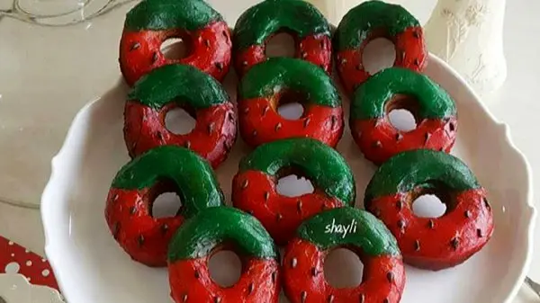 هندوانه را به شکل دونات برش دهید. تنها کاری که باید انجام دهید این است که برشهای گرد به ضخامت 4 سانتیمتر ایجاد کنید و یک سوراخ در مرکز آن به وجود آورید. شکر را به خامه ترش اضافه کنید و هم بزنید تا شیرین شود. همچنین میتوانید مقداری عصاره وانیل اضافه کنید تا خوشمزهتر شود. برشهای دونات هندوانه را در یخچال بگذارید و در آخر با خلال بادام روی آن را تزئین کنید.