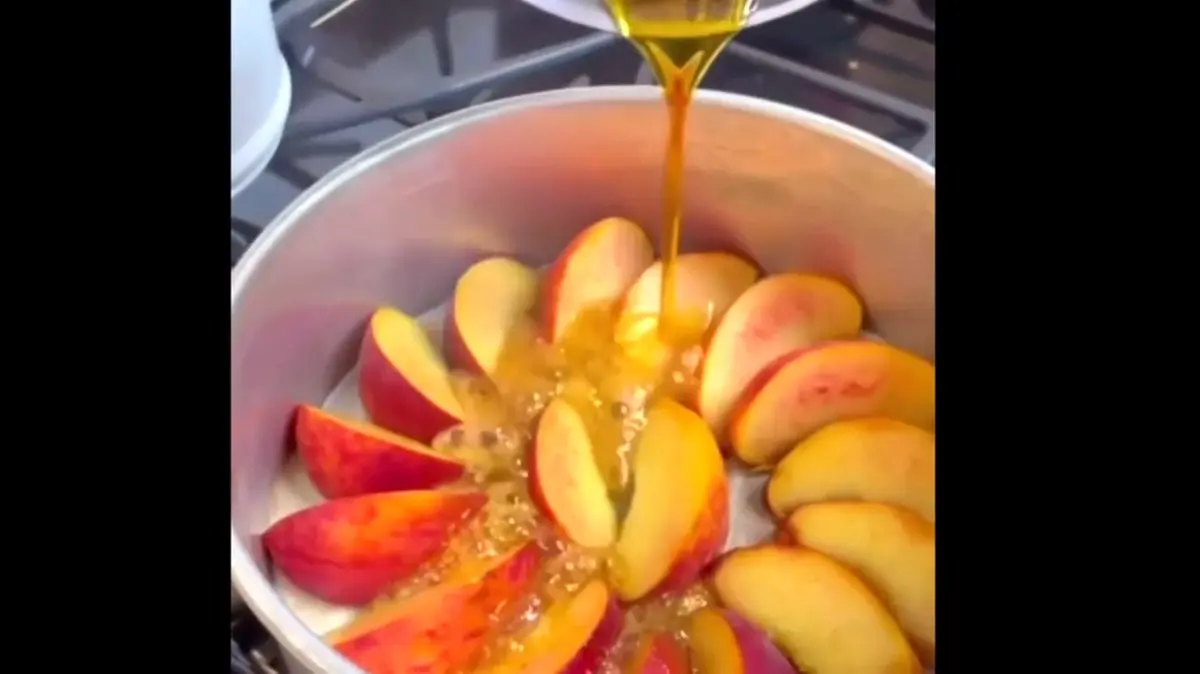 سپس کف قالب 23 -22 سانتی کاغذ روغنی پهن کنید و‌ با اسپری نچسب چرب کننده رویش را چرب کنید و برش های هلالی هلو را کف قالب مثل فیلم بچینید و‌ رویش‌ کارامل (شکر آب شده) را بریزید. کاسه بزرگی را بردارید و یک لیوان شکر گرانول و شکر قهوه ای روشن را داخلش بریزید.
