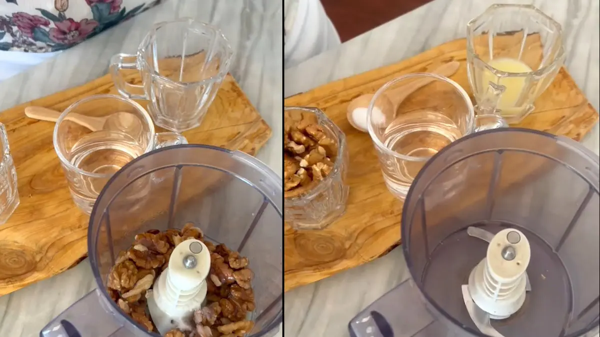 مغز گردوی خام را به همراه نمک و آبلیمو در دستگاه میکسر بریزید. کم کم آب را اضافه کنید و آنقدر میکس کنید تا گردو به خوبی له و صاف شود و ترکیب سفید رنگی به دست بیاید. باید نه خیلی رقیق و نه خیلی سفت باشد مثل غلظت کشک.