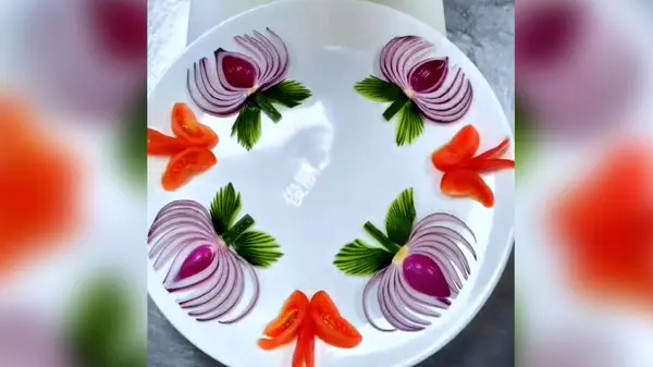 به گزارش رکنا، تزئین سبزیجات و صیفی جات در زیباتر شدن سالاد و میز پذیرایی شما از مهمان هایتان بسیار موثر است. در این فیلم می بینید که پیاز را برش های بسیار باریکی زده اند و همچنین خیار را نواری بریده اند و با قرار دادن آنها در کنار هم گل های زیبایی را با پیاز درست کرده اند. در بین این گل های ساخته شده با پیاز و خیار گوجه فرنگی های بریده شده به شکل پروانه را قرار داده اند و در نهایت بشقاب شما به طبیعت زیبا با گل و پروانه از جنس صیفی جات مزین شده است.