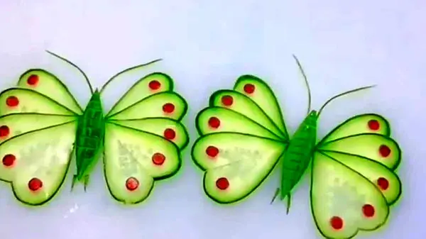 به گزارش رکنا، برای تزئین خیار به شکل پروانه کافی است که برش های نازک و منظمی را با چاقو به آن بزنید و بعد با قرار دادن آنها در کنار هم بال های پروانه را بسازید. قسمتی از خیار را هم به عنوان بدن پروانه در وسط بال ها بگذارید و باز هم برای ساخت شاخک های پروانه از برش بسیار نازک پوست خیار مطابق فیلم استفاده کنید. در ادامه برای زیباتر شدن این تزئین می توانید برش گرد و بسیار ریزی از یک سیب را روی هر بال پروانه بگذارید.