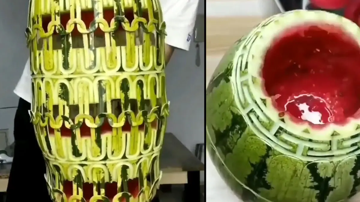 به گزارش رکنا، هندوانه در بسیاری از جشن ها به عنوان تزئین میوه جات استفاده می شود. در این فیلم مشاهده می کنید که با برش زدن بخشی از هندوانه و تخلیه محتویات آن و سپس ایجاد برش های زیبا و هندسی شکل مطابق فیلم با کاردک یا چاقو روی آن می توان دور پوست مانده هندوانه را تزئین کرد و بعد با باقیمانه پوست هندوانه همین کار را تکرار کرد و در پایان با پوست هندوانه زنجیر زیبایی را خواهید ساخت.