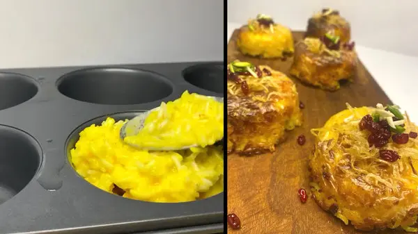 در ادامه نصف برنج آبکش شده را به کاسه حاوی زرده تخم مرغ اضافه می کنیم و به خوبی مخلوط می کنیم تا برنج با مواد کاملا یکدست شود. حالا یک قابلمه مناسب انتخاب می کنیم و کف و بدنه آن را با روغن مایع چرب می کنیم.