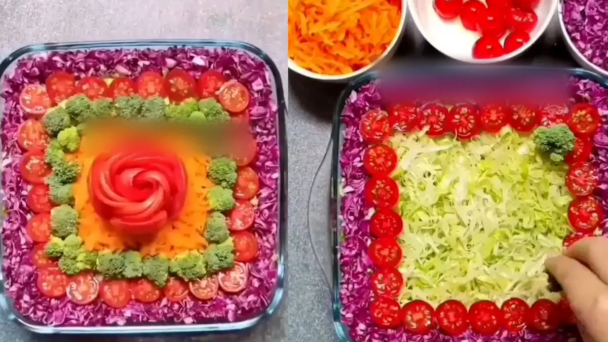 به گزارش رکنا، تزئین سالاد را به شکل متفاوت ببینید. کافی است کف ظرف را یک ردیف کامل کاهوی خردشده بریزیدو بعد دور آن را به شکل یک قاب با کلم بنفش پر کنید. سپس در لایه بعدی گوجه فرنگی های خرد شده را دورتادور آن بچینید و در لایه بعد کلم بروکلی قرار می دهیم. هرچه به مرکز ظرف نزدیک تر می شویم مربع ما کوچکتر می شود که آخرین لایه را با هویج رنده شده می پوشانیم. در انتها روی این سالاد فصل رنگی یک گوجه فرنگی را که به شکل گل درآورده اید قرار دهید.
