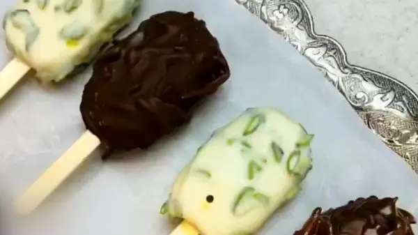 قالب را 12 ساعت داخل فریزر می گذاریم تا کاملا ببندد، بعد از قالب در می آوریم و شکلات تخته ای سفید و شکلات تخته ای کاکائویی را روی بخار کتری بن ماری می کنیم و روغن مایع را به آن اضافه می کنیم تا روان شود (کمی خلال پسته داخل شکلات سفید ریخته و کمی مغز بادام داخل شکلات کاکائویی ریخته) و بستنی ها را داخل شکلات می زنیم و در می آوریم چون بستنی یخ هست شکلات زود می بندد. حتی می توانید این مواد را داخل یک ظرف ریخته و بعد از یخ زدن اسکوپ بزنید.