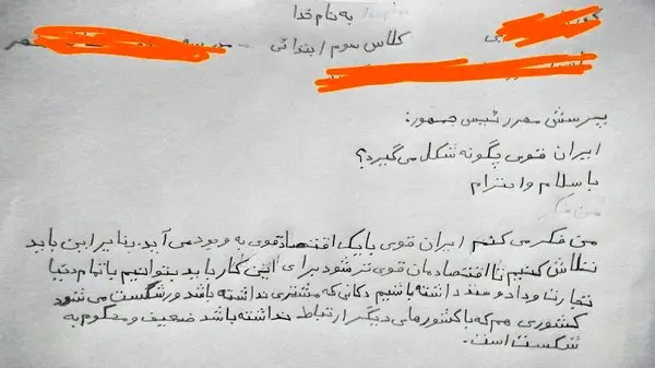 نامه یک دانش آموز کلاس سوم دبستان به رئیس جمهور / برای داشتن ایران قوی باید اقتصادمان را قوی کنیم + عکس