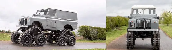 رکنا: قرار است نسخهای از یک لندرور کلاسیک برای فروش گذاشته شود که بهجای چرخ، همانند تانکهای نظامی دارای شنی است.