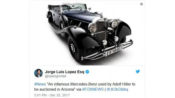 خانه حراج «Worldwide Auctioneers» مستقر در ایالت آریزونای آمریکا اعلام کرد که قصد دارد یکی از خودروهای آدولف هیتلر را به حراج بگذارد.