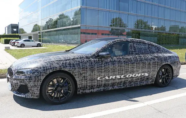 عضو جدید خانواده سری 8 پیشنمایشی با کانسپت M8 گرن کوپه در نمایشگاه ژنو امسال داشته است. همانگونه که در خودروی تست شده دیده میشود، این خودروی چهار درب در پنهان کردن خطوط دینامیک بدنه کار خود را بهخوبی انجام داده است. خودروی مورد بحث هماکنون طول بیشتری دارد تا به این ترتیب فضا برای دربهای عقب باز شود.