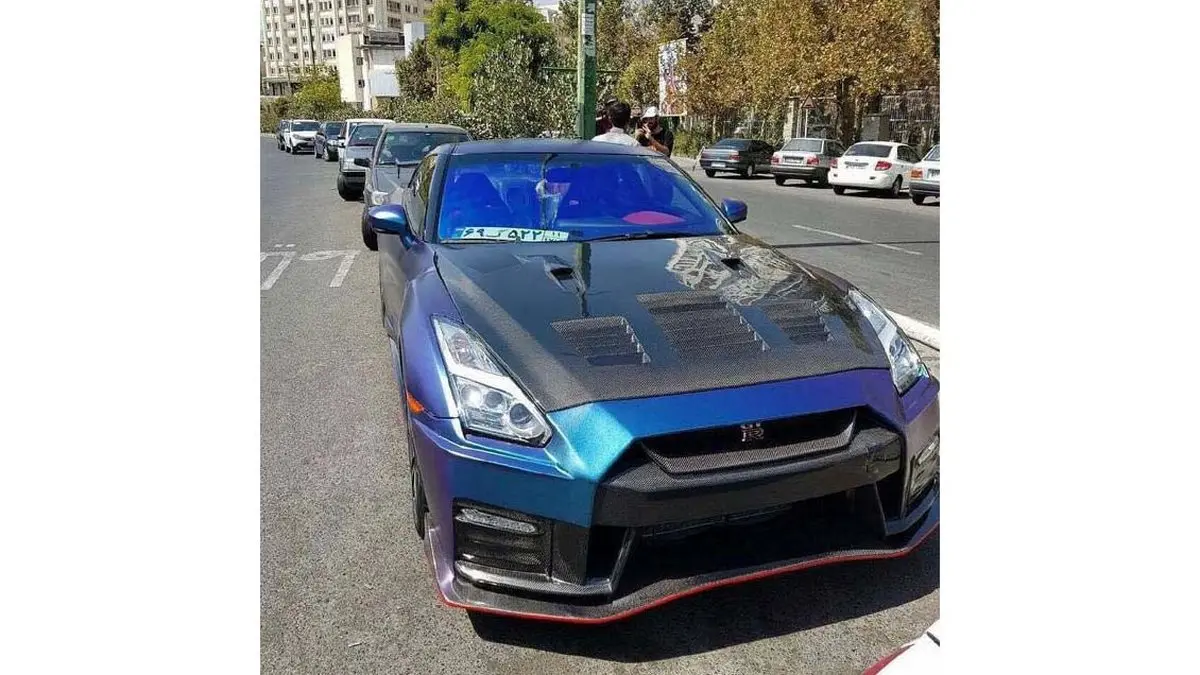 رکنا: تصویری از خودروی پرقدرت (Nissan GT-R) معروف به گودزیلا با پلاک گذرموقت که در یکی از خیابانهای تهران پارک شده است.