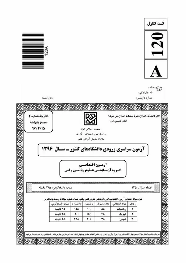 رکنا: دفترچه سئوالات اختصاصی رشته ریاضی و فنی کنکور 96 منتشر شد.